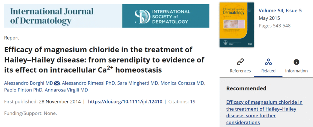 En effet, une équipe italienne a publié en 2014 sa recherche montrant l’efficacité du chlorure de magnésium pour la maladie de Hailey-Hailey :