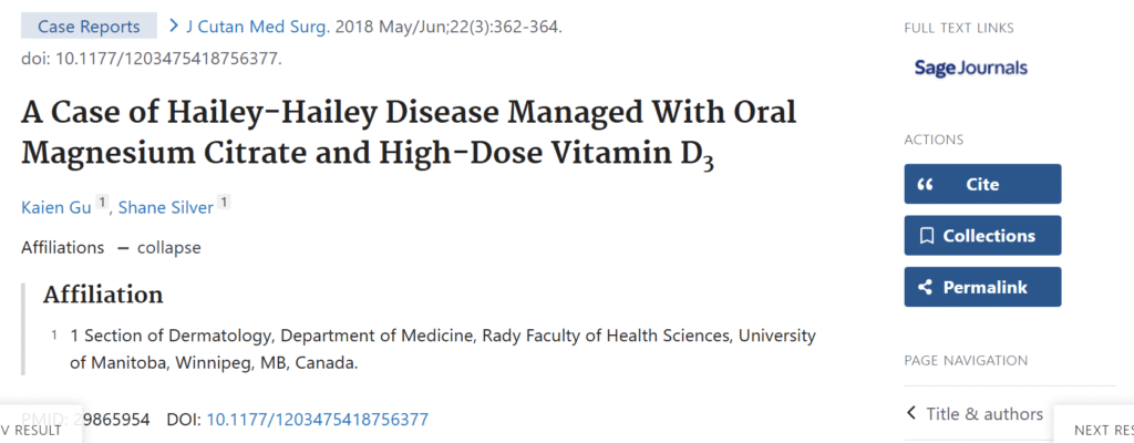 Dans le cas publié en 2018, les chercheurs ont mis en évidence un cas unique de maladie de Hailey-Hailey qui était résistante à de nombreuses thérapies conventionnelles et finalement gérée avec du citrate de magnésium oral et de la vitamine D3 à forte dose.
