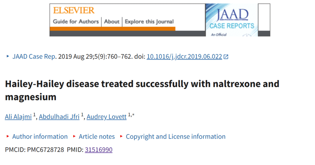D’autres chercheurs ont rapporté le cas d’un patient avec une maladie de Hailey-Hailey récalcitrante qui s’est améliorée considérablement avec la combinaison de supplémentation orale en chlorure de magnésium et de naltrexone.
