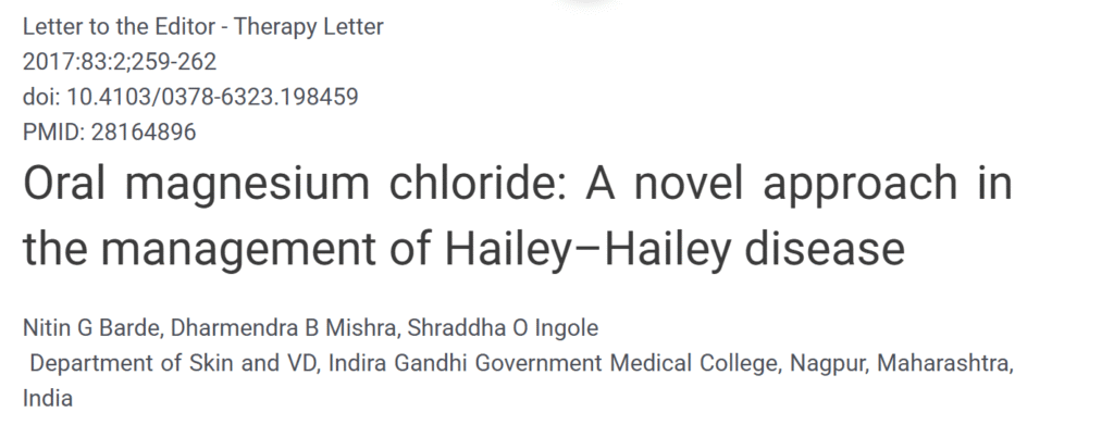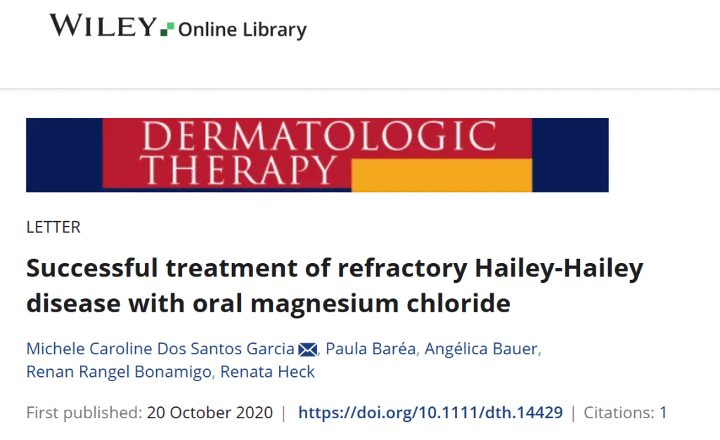 Dans une publication de 2020, d’autres chercheurs confirment l’efficacité du chlorure de magnésium oral pour la maladie de Hailey-Hailey :