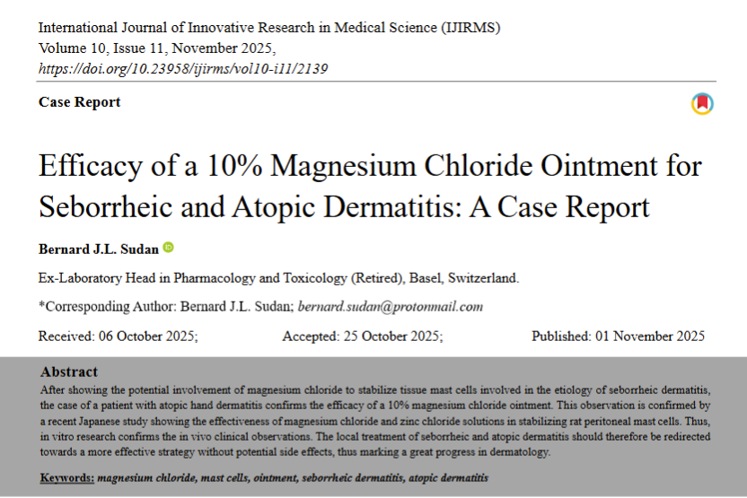Leur recherche bibliographique analyse les travaux concernant plusieurs maladies de la peau. Par exemple, elles insistent sur trois maladies de la peau, l’acné, la dermatite atopique et le psoriasis. Elles oublient donc la dermatite séborrhéique qui réagit très bien avec des produits de la mer Morte contenant environ 30% de chlorure de magnésium. De plus, depuis 2024, une crème à 10% de chlorure de magnésium a montré sa grande efficacité !